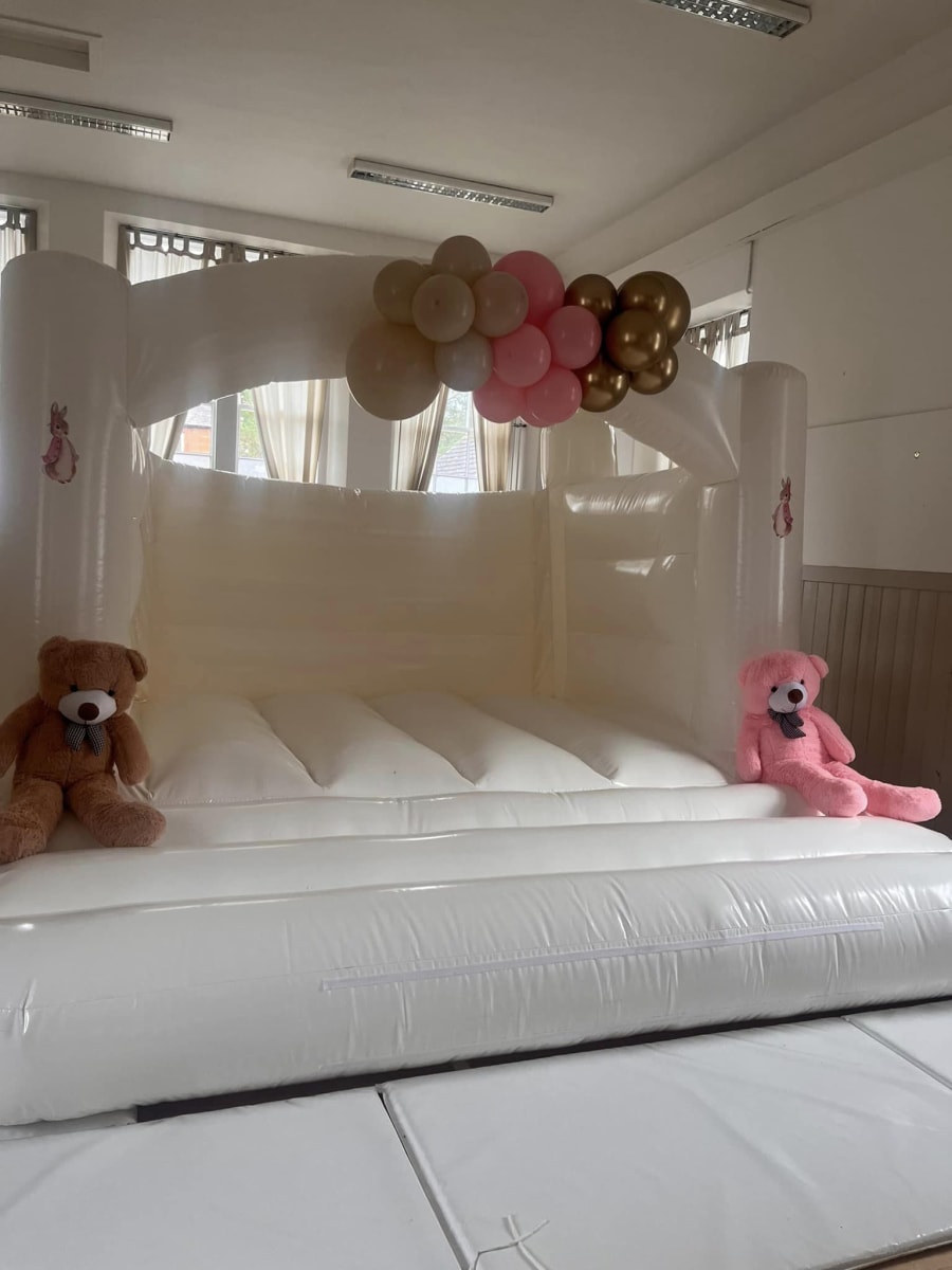 At Bake and Inflate, we know every little detail matters. Crafted from high-quality, durable materials, our white bouncy castle ensures every gentle jump and sweet bounce is wrapped in the coziest cocoon of safety. Let the kids (and adults!) hop, skip, and jump to their heart's content while you enjoy the smiles and laughter that fill your special day.