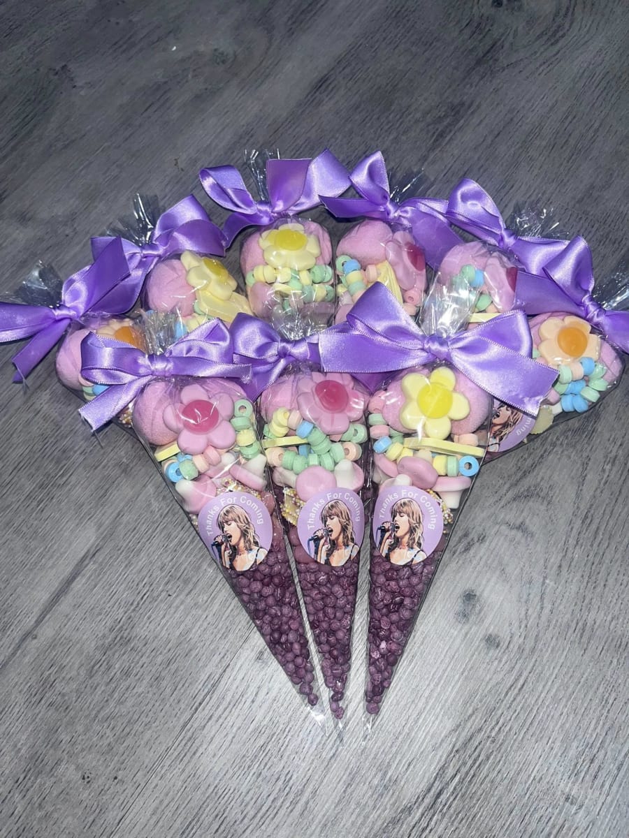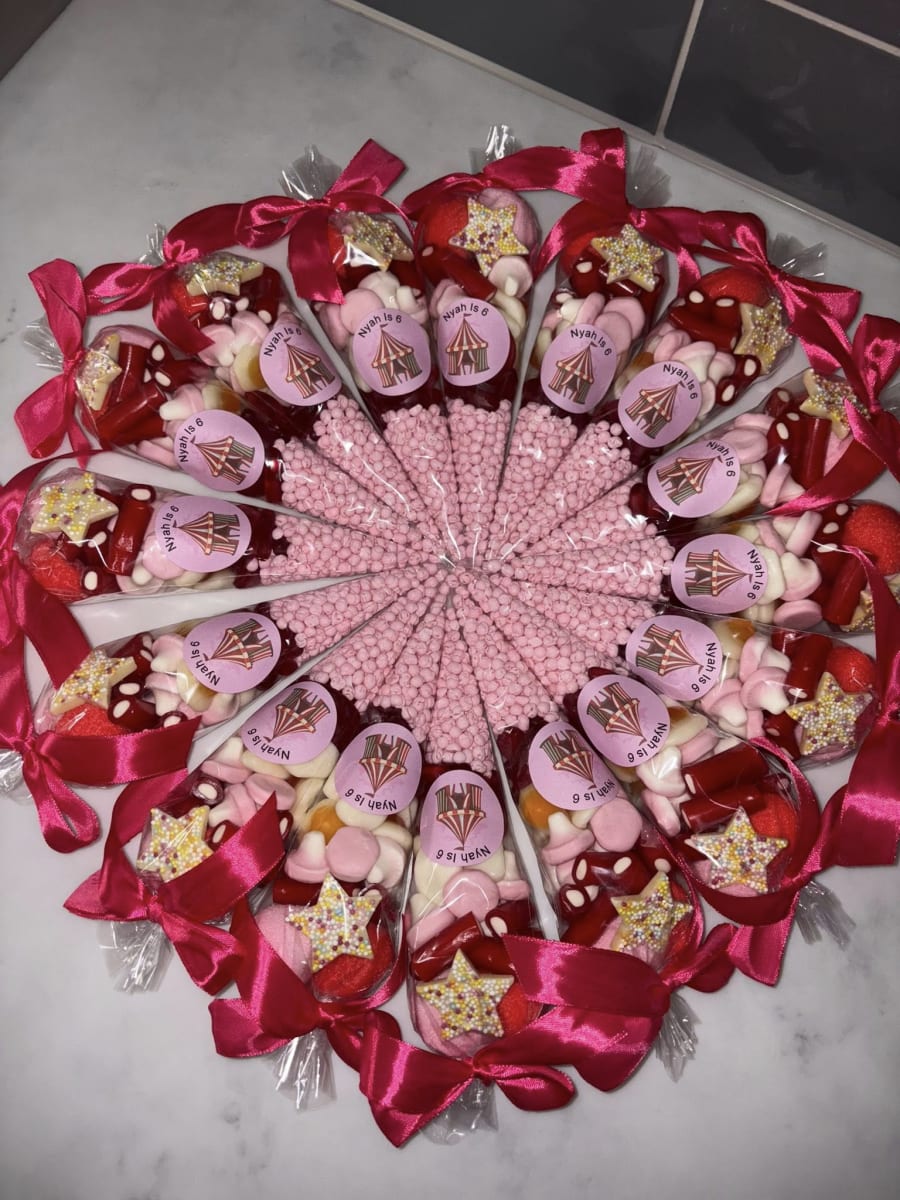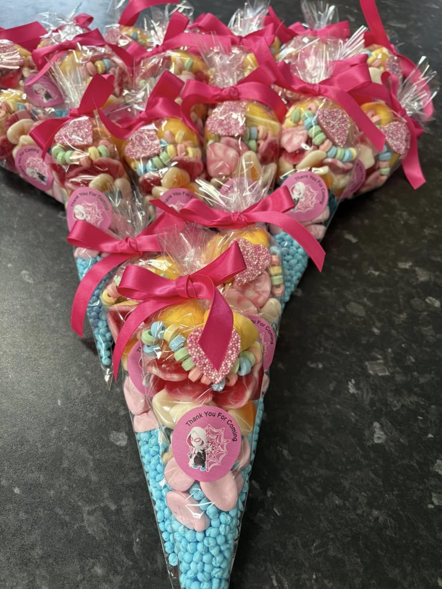 Sweet Cones Delicious Treats for Any Occasion! Brighten up your celebrations with our delightful Sweet Cones! Perfectly packed with a variety of delicious candies, they’re an irresistible treat for both kids and adults. Ideal for birthdays, parties, or as a special gift, these cones are sure to bring smiles to everyone's faces. 🍬 Features: Assorted Sweets: Each cone is filled with a carefully selected mix of candies that includes gummies, chocolates, marshmallows, and more. Eye-Catching Design: Beautifully presented in a clear cone-shaped bag with a colourful ribbon, making it a perfect addition to any party display. Generous Size: Each cone holds plenty of sweets to satisfy every sweet tooth, ideal for party favours or giveaways. Customizable Options: Personalize your sweet cones with custom labels or tags for birthdays, weddings, baby showers, or corporate events. 🎉 Perfect For: Birthday Parties: Add a touch of sweetness to your celebrations with these fun and festive favours. Weddings and Baby Showers: Elegant and customizable, sweet cones are a charming addition to your special day. Holiday Celebrations: Whether it’s Halloween, Christmas, or Easter, sweet cones make delightful seasonal treats. Corporate Events: Impress your guests with customized sweet cones, perfect for any corporate gathering or marketing event. 💡 Why You'll Love It: Our Sweet Cones are not just a treat, they are an experience! Bursting with a variety of flavours and textures, each cone promises a delightful surprise. They are perfect for party favours, gifts, or simply to indulge in a moment of sugary bliss. Order your Sweet Cones today and make your next event unforgettable with these delicious and beautifully presented treats! 🍭✨🍫