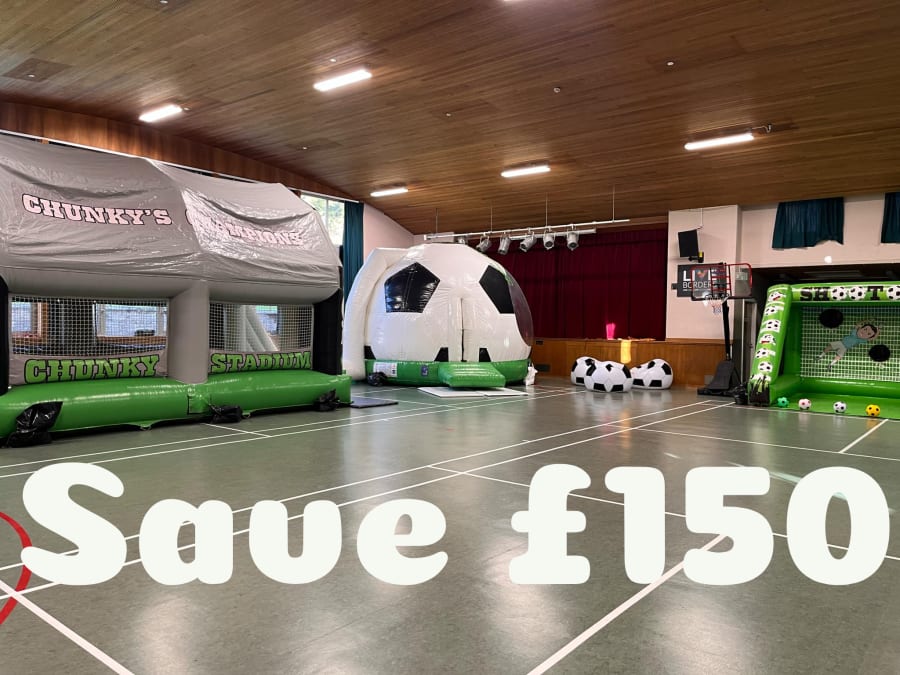 Large Football-Themed Party Extravaganza ⚽️🎉🎈 Get ready to blow the whistle on an unforgettable party experience with our all-inclusive Large Football-Themed Party Package! It’s packed with thrilling inflatables and endless fun, making every moment a delightful game-changer. Here’s what’s in store for your all-star celebration: Magical Inflatables Line-Up: 🏰✨ 20ftx20ft Football Dome: 🥅🏟️ Step inside our grand Football Dome and prepare to be amazed! At a whopping 20ftx20ft, this inflatable wonderland is the perfect place for fun and games. Decorated with vibrant football motifs, it’s the heart of your party where joy bounces higher than any header! 23ft x 14ft Football Arena: ⚽️🌟 It’s game time! Our expansive Football Arena is where friendly matches and friendly rivalries come to life. This 27ft x 14ft inflatable pitch is fully equipped for hours of play, perfect for budding footballers and fans alike. Ready, set, play! Beat the Goalie Shootout: 🥅🎯 Who’s got the best shot? Find out with our exhilarating Beat the Goalie Shootout! It’s all about precision and speed as players line up to score against our inflatable goalie. Challenge your friends and family to see who’s the ultimate striker! 15ft Mega Slide: 🎢🎉 Slide into the fun with our 15ft Mega Slide! This towering inflatable slide adds an extra dash of thrill to your party, inviting guests of all ages to swoosh down and cheer with glee. It’s a high-flying adventure that promises endless laughter and joy! 3 Inflatable Football Chairs: 🪑⚽️ Rest and relax like a true football star with our cozy Inflatable Football Chairs. Perfect for sitting back and soaking in the festive atmosphere, these chairs offer comfort and style. Grab a seat, take a breather, and get ready for the next fun-filled game! The Perfect Pitch for Parties: 🎈🥳 At Bake and Inflate, we believe it’s the little touches that make every event extraordinary. Our Large Football-Themed Party Package is crafted with love and attention to detail, ensuring your celebration is filled with joy, energy, and unforgettable memories.